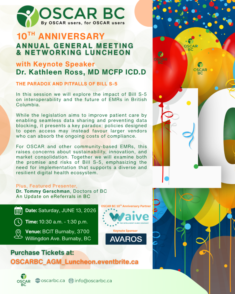 OSCARCON 2025: Integrate. Innovate. Improve. was held on June 7, 2025 at BCIT Burnaby. Amidst the dynamic landscape of healthcare technology, characterized by AI advancements and market turbulence, as well as an increased administrative burden on all healthcare providers, OSCARCON 2025 aims to offer learning sessions for new and seasoned OSCAR Users and developers, and to explore how the shifting landscape will continue to impact healthcare providers and EMR users.